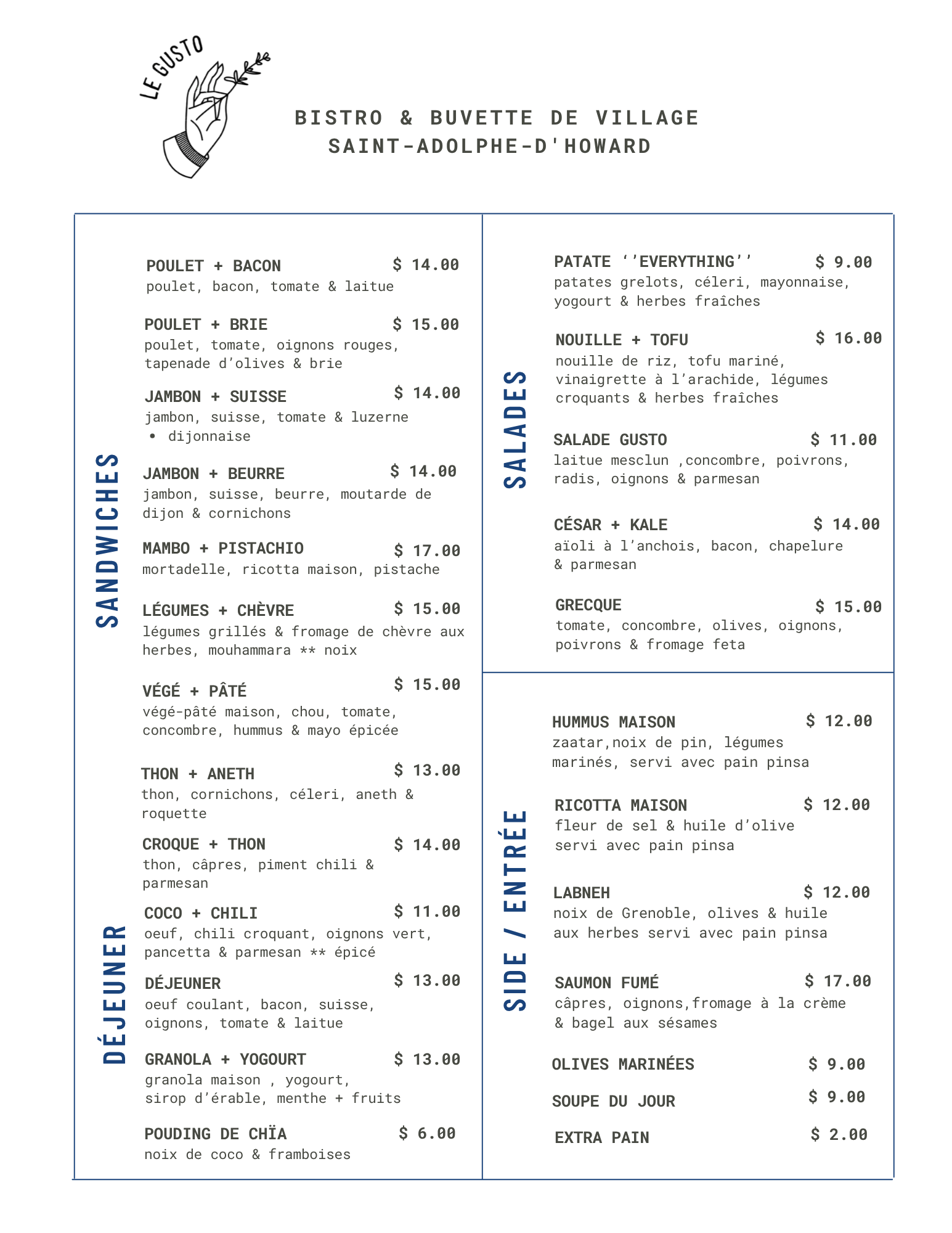 Pour toute information sur le menu traiteur communiquer par email info@legusto.ca ou par téléphone 819-714-0077